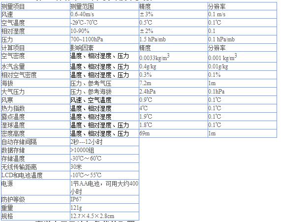 • 測量:蒸發(fā)速率、空氣流量、空氣體積、空氣密度、相對空氣密度、Delta-T等 • 大屏幕,高分辨率,高對比度,數(shù)據(jù)圖表顯示,在明亮的陽光下具有較好的可讀性,具有背光,可以夜晚使用。 • 手持便攜式氣象站,具有數(shù)據(jù)存儲功能,數(shù)據(jù)制表功能。 • 可選由Bluetooth Smart® 提供的LiNK,可以通過無線與手機或電腦進行連接 • 堅固耐用(跌落測試符合MIL-STD-810G標準),完全防水(防護等級IP67),能夠漂浮在水上。 • 配件包含:保護袋,頸繩,AA鋰電池 2年保修。