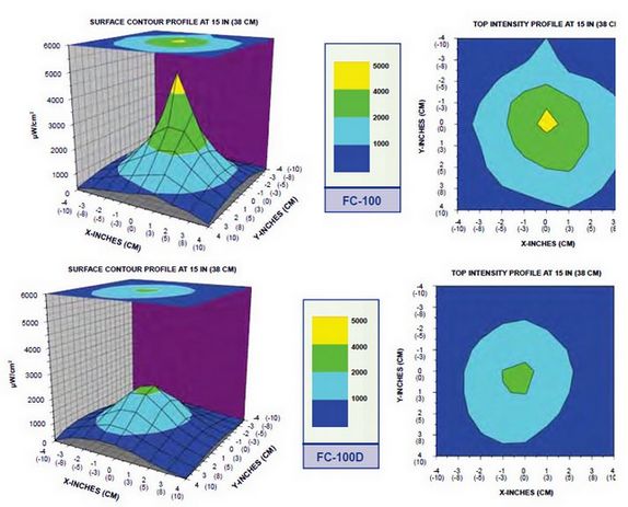 超高強度 15”距離(38cm),標準型號FC-100紫外強度達5000µW/cm² ,配散光濾色片的FC-100D紫外強度達2200µW/cm²。