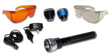 OFK-300 OPTIMAX™ Multi-Lite™ 多波段警用檢查套裝配有結實的黑色陽極化鋁手電殼體、三個可快速更換的LED燈頭(UV-A(長波紫外)、藍光、及白光)、交流及直流充電器、兩個眼鏡(紫外防護及橙色眼鏡)及一個帶泡墊的手提箱.。